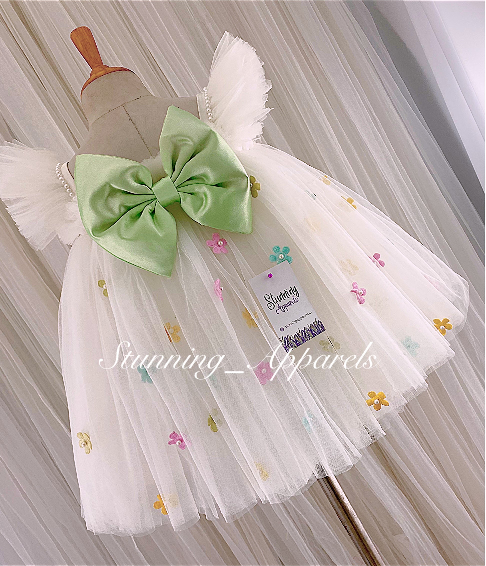 Multi Colour Flower Work, Pista Green Satin Bow White Umbrella Dress