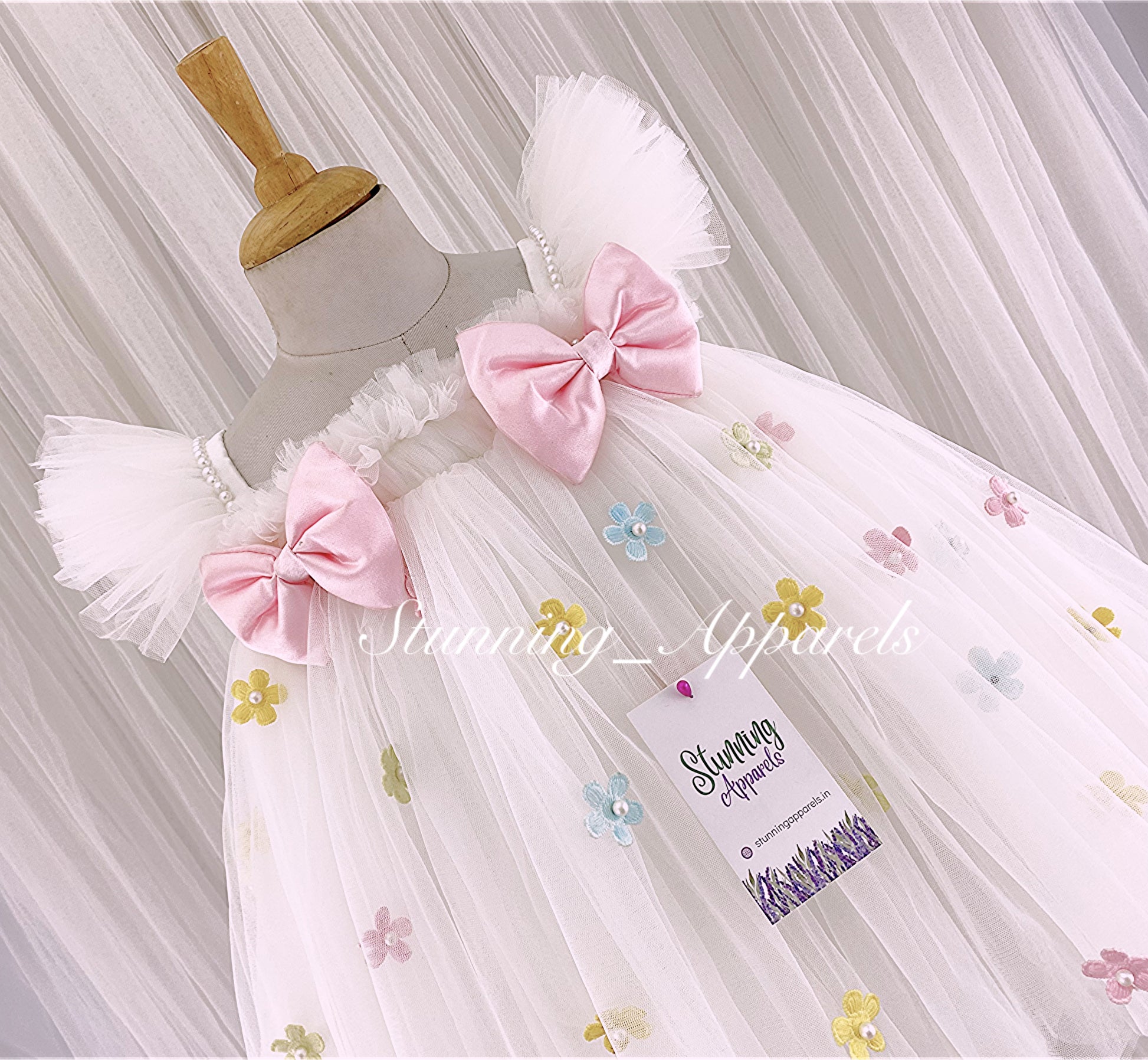 Multi Colour Flower Work, Baby Pink Satin Bow White Umbrella Dress